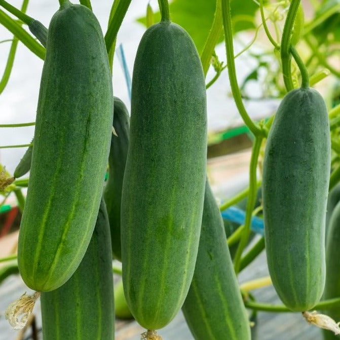 Harvesting can be done 55-65 days after sowing. On average 8 10 harvests can be done. Don't let cucumbers get too large or they will taste bitter. At peak harvesting time, you should be picking cucumbers every couple of days. Harvest regular slicing cucumbers when they about 6 to 8 inches long. Do not let them get yellow, the cucumber is of the highest quality when it is uniformly green, firm, and crisp. Any cucumbers left on the vine too long will also get tough skins and lower plant productivity. |